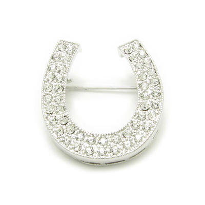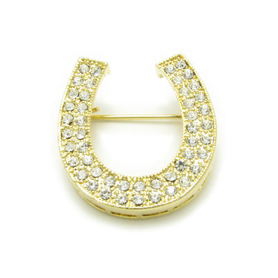 【メール便 送料無料】 馬蹄デザインのシンプルなピンブローチ 馬蹄は幸運を招くラッキーモチーフと言われ人気のデザインです たっぷり飾ったラインストーンも華やかでとっても美しい スーツやジャケットの襟もとにはもちろん! ワンピースやバック、帽子などお好きなところに着けて楽しんでください 素材:合金 サイズ:約30mm×約27mm 重さ:約7g 金具:安全ピン式