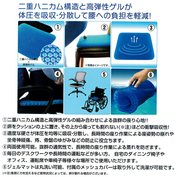 また、卵を置いた上から座っても割れない衝撃吸収性が今とても話題になっているジェルクッション、座ると体圧が分散されて楽に座れることを実感できます。