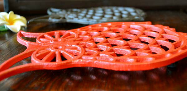 アイアン製ですので耐熱性が高く鍋敷きやヤカンなどの敷物としても大活躍!裏面には家具にキズを付けない様にゴム製の脚が設置しておりますので安心♪