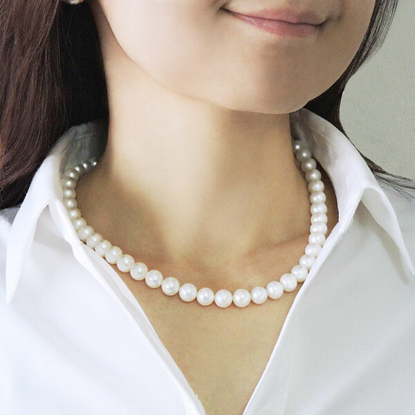 また、淡水パールとは思えないほど綺麗な逸品のため、限定5本までとなりますのでお早めにご注文を! □ 詳 細 □ 真珠の詳細淡水真珠 大きさ:9-9.5mm 色:ホワイトピンク系 形:セミラウンド真珠のグレード照り:AA キズ:AA クラスプ(留め金具)の材質SV シルバー ネックレスの長さ約:43cm 付属品 弊社の品質保証書、専用ケース 備考 ※自然光の下で撮影しております。