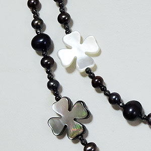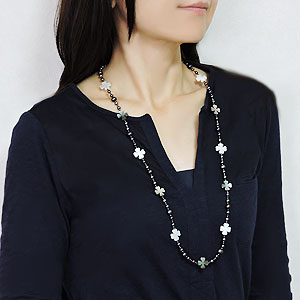 おすすめポイント ブラック系のマルチカラー淡水真珠とブラックとホワイトのシェルのお花を組み合わせたシックなカラーが印象的なロングネックレスです。
